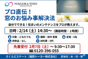 blog 2/17(土)14:30~ おおむたまちゼミ開催 プロが教える、自分でできる住まいのメンテナンス講座! 今回は「窓のお悩み」にフォーカスした解決法を伝授します。 日時:2/17(土)14:30~ 先着受付 2/7(土)~ 9:30~17:30 0120-396-055 さくらエステート(福岡トーヨー株式会社) ぜひご参加をお待ちしております!(^^)! 前の記事 一覧へ戻る