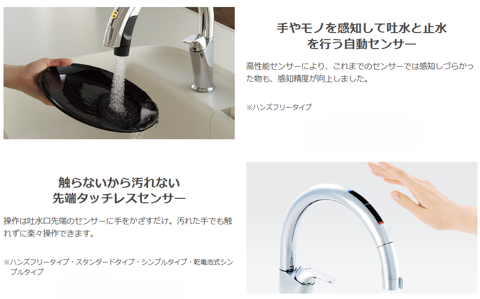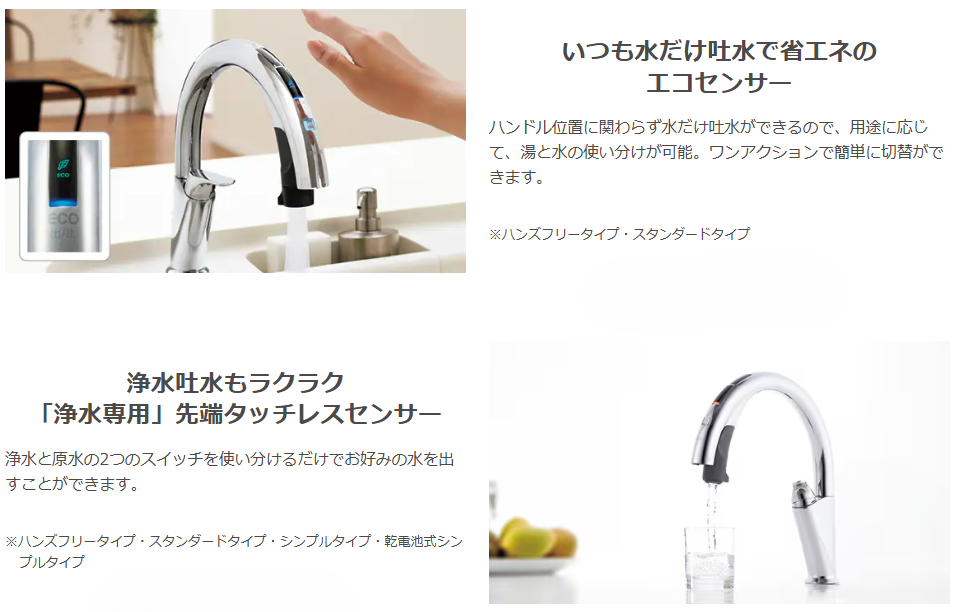 ・エコセンサー(一部タイプ): タッチレスのセンサー部に「水だけを吐水する機能」を追加。無意識にお湯を使うのを防ぎ、給湯エネルギーの無駄遣いを防ぎます。